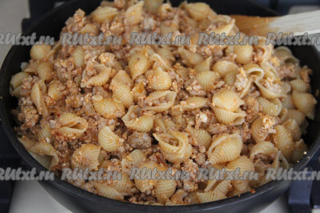 Добавить в сковороду к фаршу макароны и перемешать. Потомить пару минут, иногда перемешивая, чтобы макароны хорошо прогрелись.