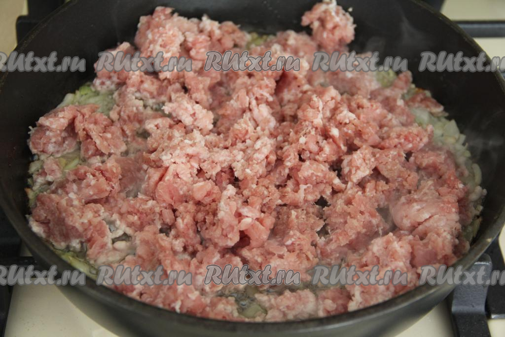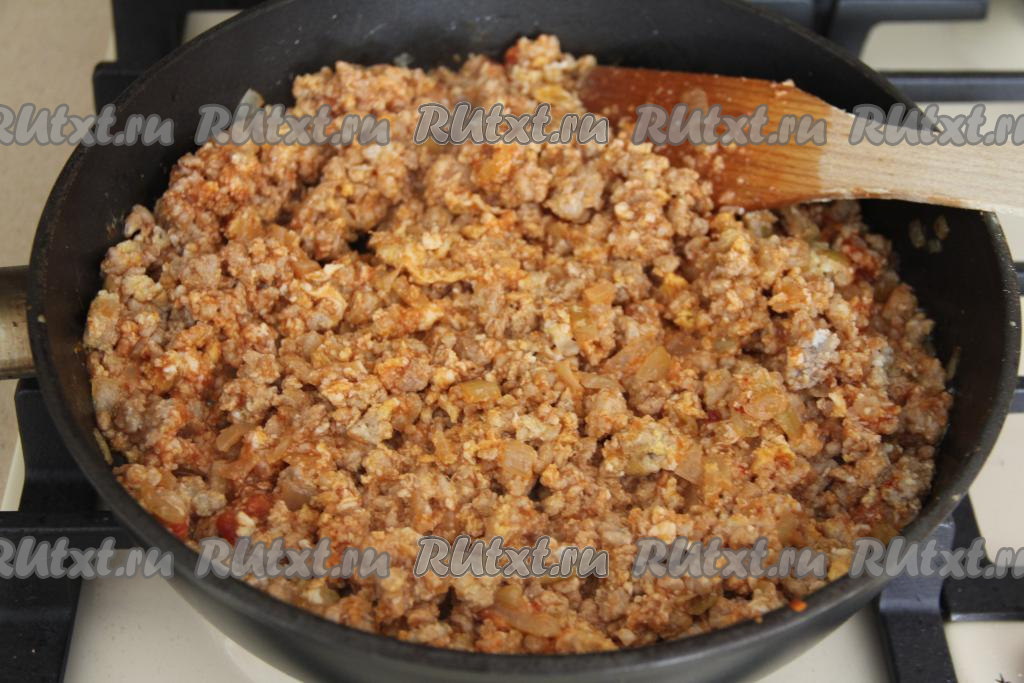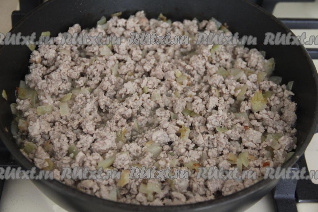 После этого выложить в сковороду фарш, перемешать, обжаривать мясо с луком минут 15, периодически разбивая мясные комочки.