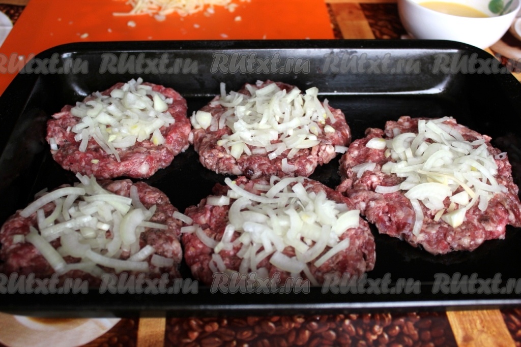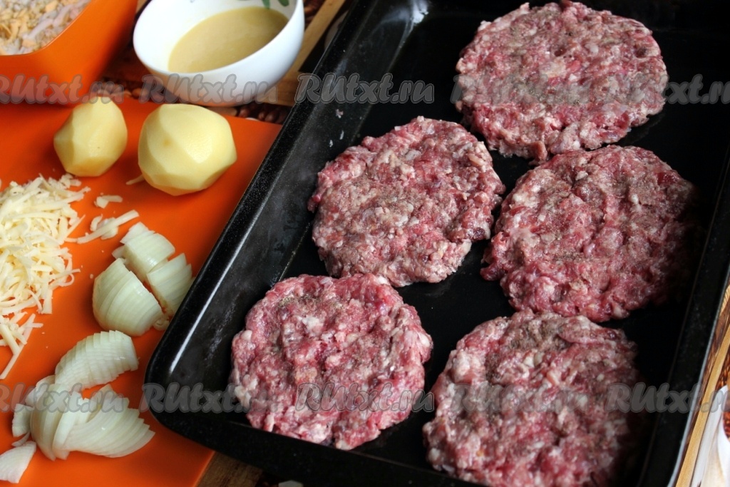 Лук нашинковать, яйца, сваренные вкрутую, картофель сырой и сыр натереть. На смазанный противень выложить круглые лепешки из сырого мясного фарша, посолить и поперчить.