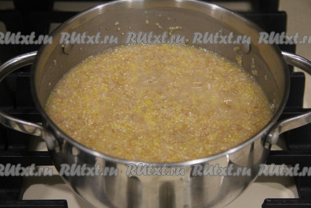 Промытую пшеничную и кукурузную крупы выложить в кастрюлю, залить водой, поставить на огонь, довести кашу до кипения, иногда перемешивая.