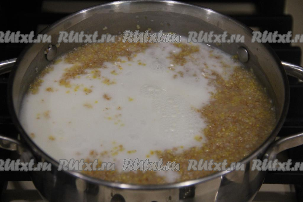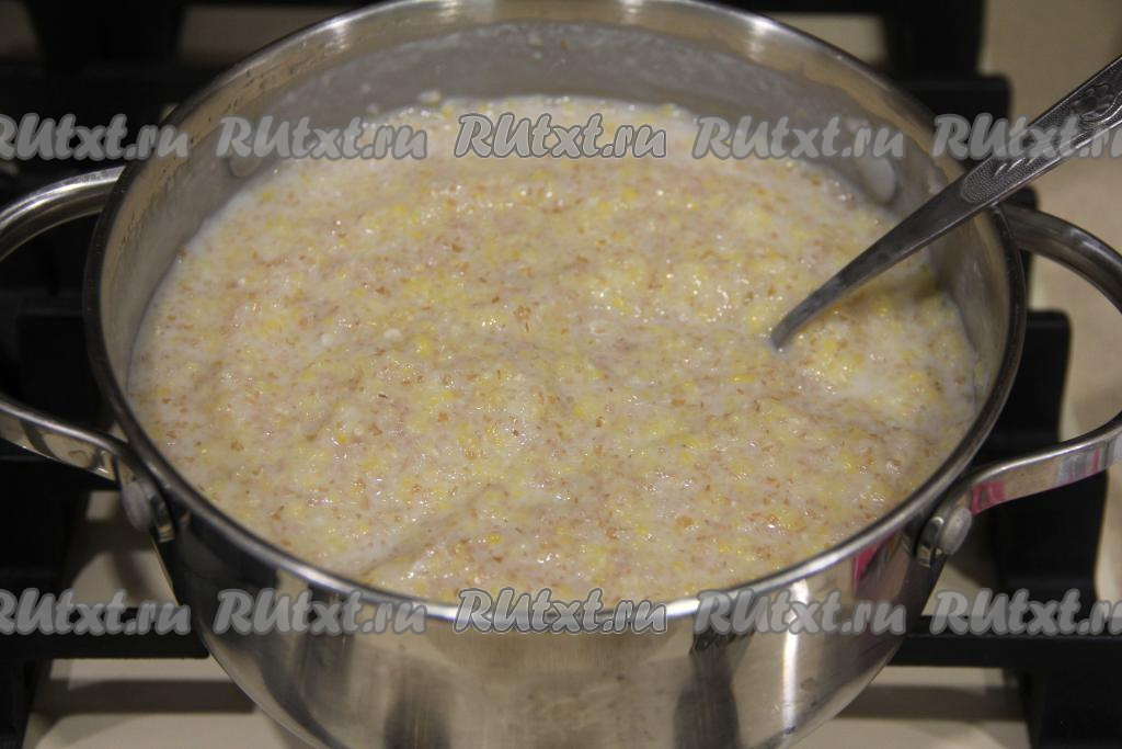 Затем влить в кастрюлю молоко, всыпать соль и сахар, перемешать, дать закипеть и варить пшенично-кукурузную кашу на медленном огне 20 минут, время от времени перемешивая.