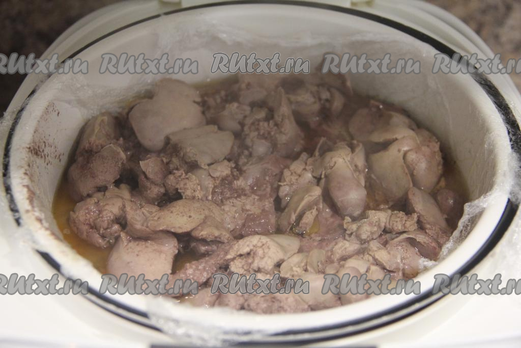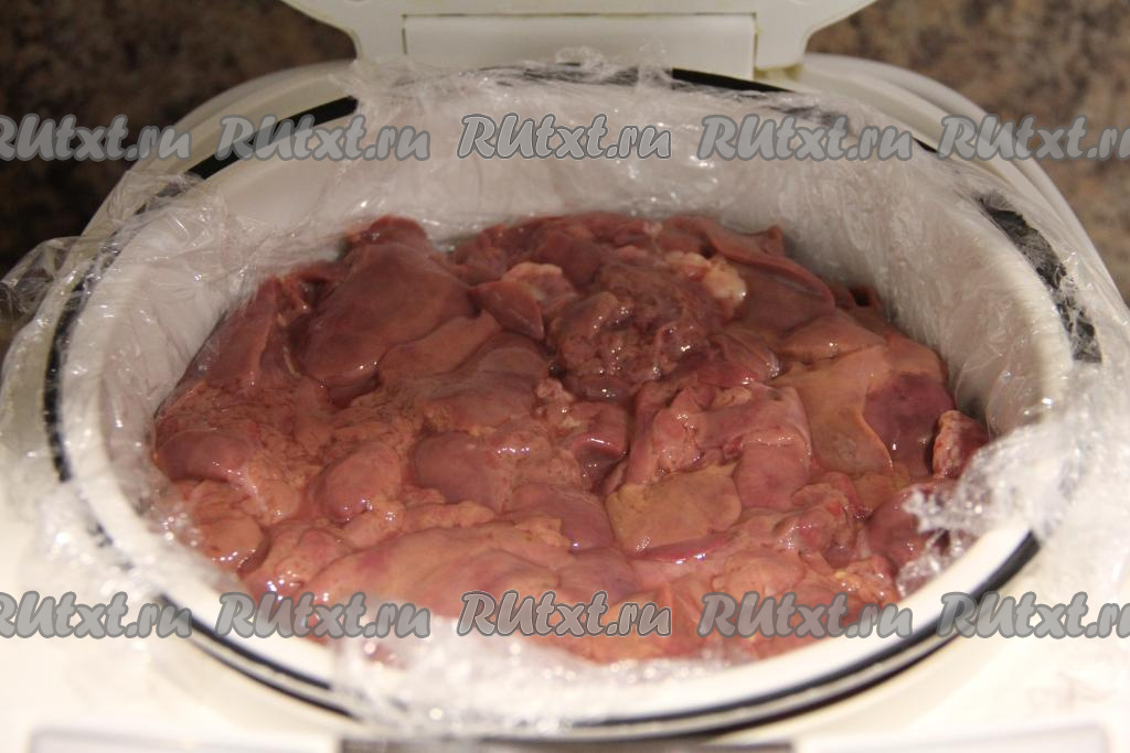 Поддон мультиварки для готовки на пару застелить пищевой плёнкой и выложить куриную печень.