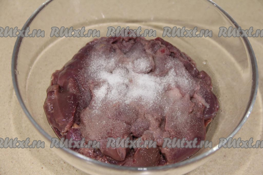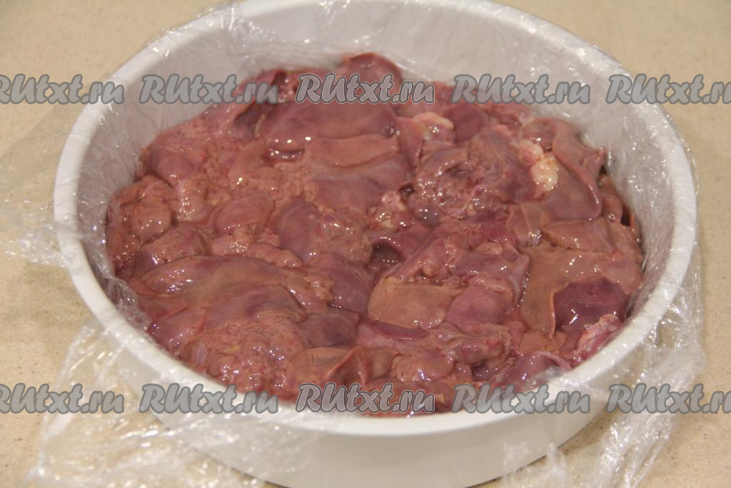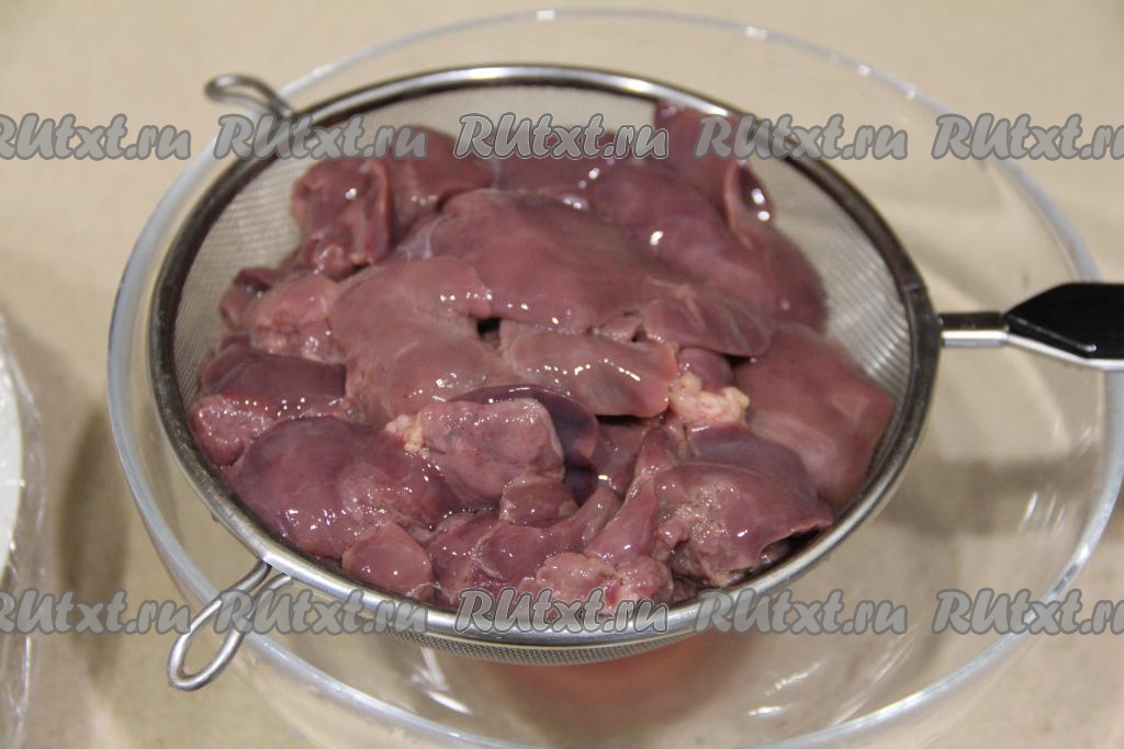 Промыть куриную печень водой, откинуть на сито (или дуршлаг), чтобы стекла лишняя вода.