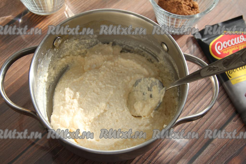 Затем в получившийся плавленый сыр из творога всыпать сахар и какао, перемешать до однородности.