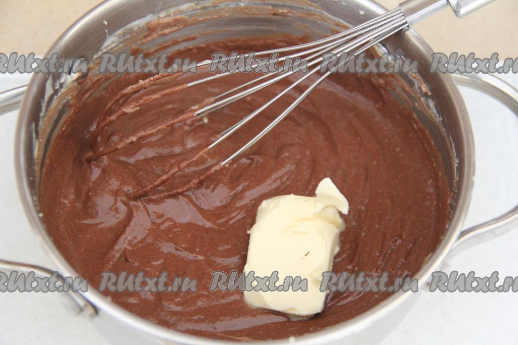 Перемешать сыр до полного растворения шоколада. Снять кастрюлю с водяной бани и добавить мягкое сливочное масло.