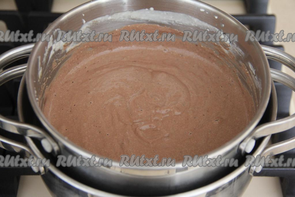Теперь нужно кастрюлю с творожно-яичной массой поставить на водяную баню. Для этого нужно взять кастрюлю большего диаметра, чем кастрюлька с творожно-яичной массой. В эту большую кастрюлю влить воду, поставить на огонь и довести воду до кипения, уменьшить огонь. Поверх кастрюли с кипящей водой поставить кастрюльку с творожно-яичной массой. Кастрюлька с творожно-яичной массой не должна находиться в воде, а должна всего лишь слегка касаться поверхности воды. Варить творожно-яичную массу 15 минут, постоянно помешивая. Масса должна полностью расплавиться.