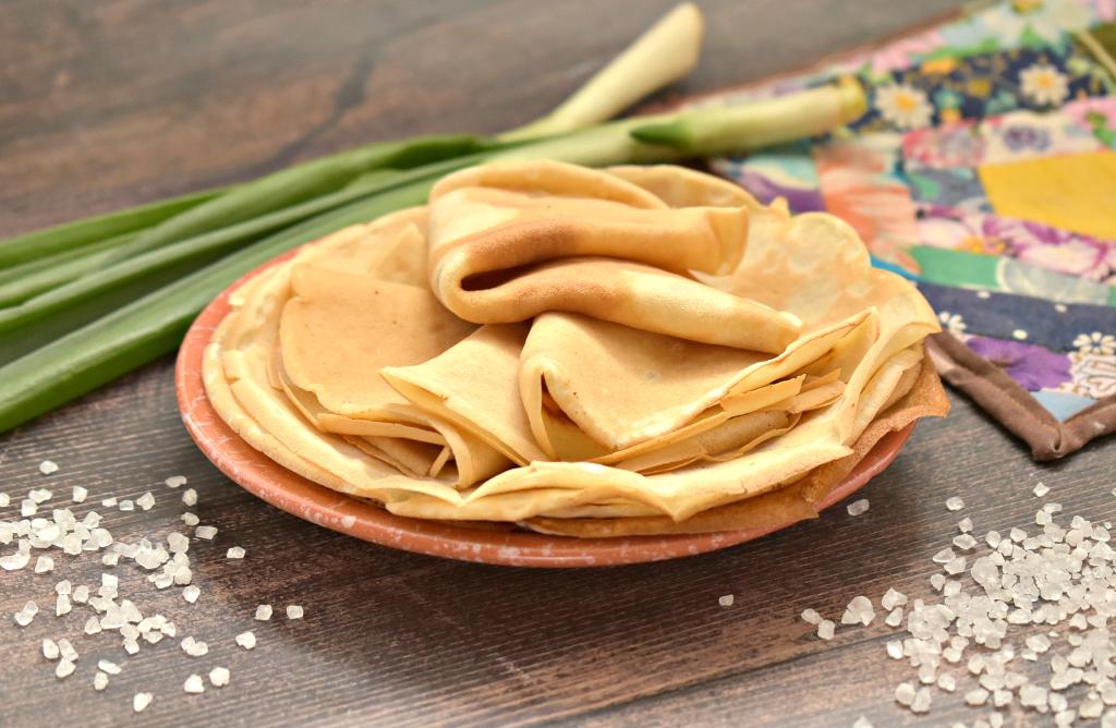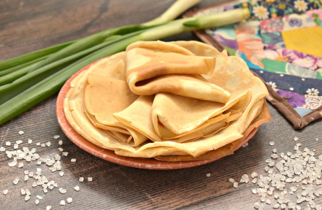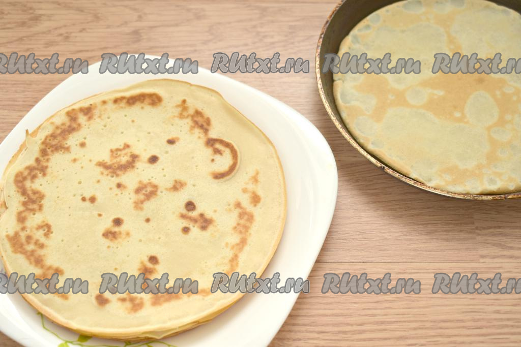 Сковороду смазываем растительным маслом, хорошо раскаливаем на достаточно сильном огне, уменьшаем огонь до среднего. Затем на сковороду вливаем половник блинного теста, распределяя его равномерно по дну сковороды. Жарим блинчик с двух сторон до подрумянивания, затем перекладываем со сковороды на тарелку. Периодически перемешивая тесто в миске, постепенно жарим все блины (я выпекала на сковороде диаметром 18 сантиметров, у меня получилось 9 нежных блинчиков), складывая их один на другой на тарелку. Смазывать сковородку больше не нужно, ведь масло присутствует в тесте.