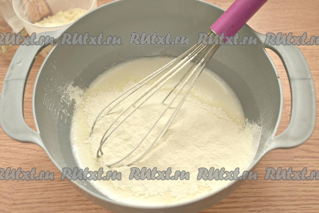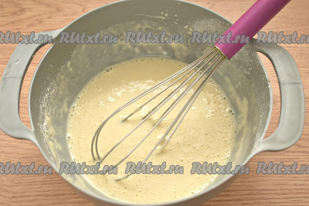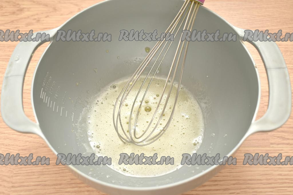 Взбиваем венчиком содержимое миски так, чтобы получилась однородная смесь, а сахар и соль растворились.