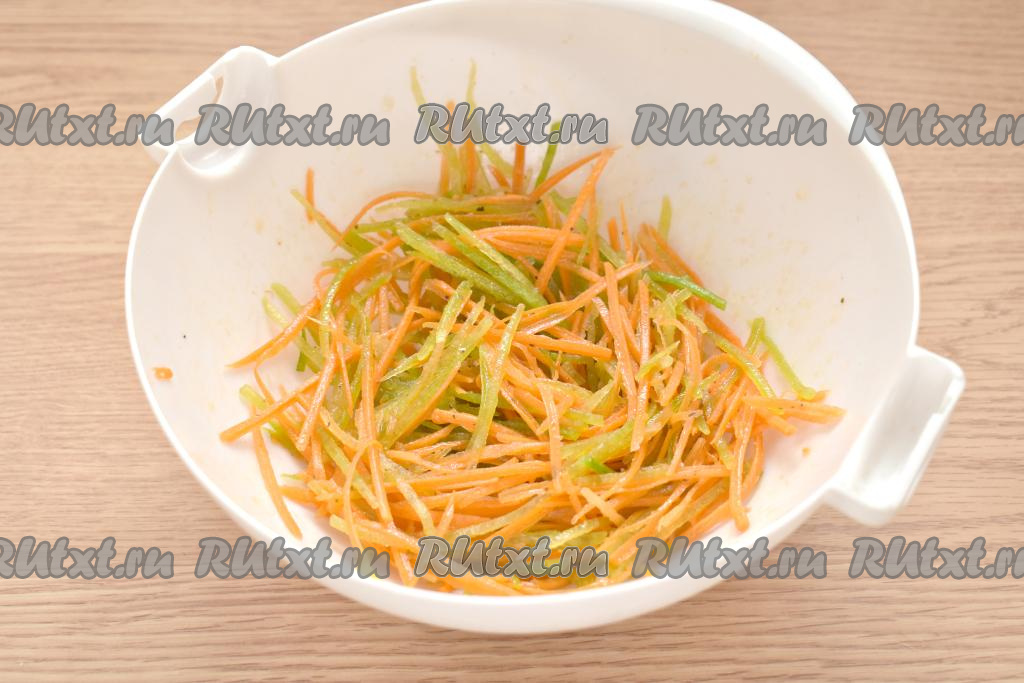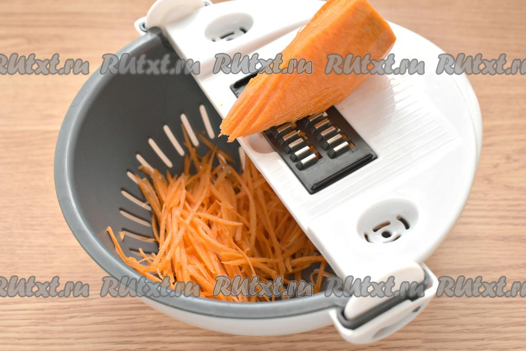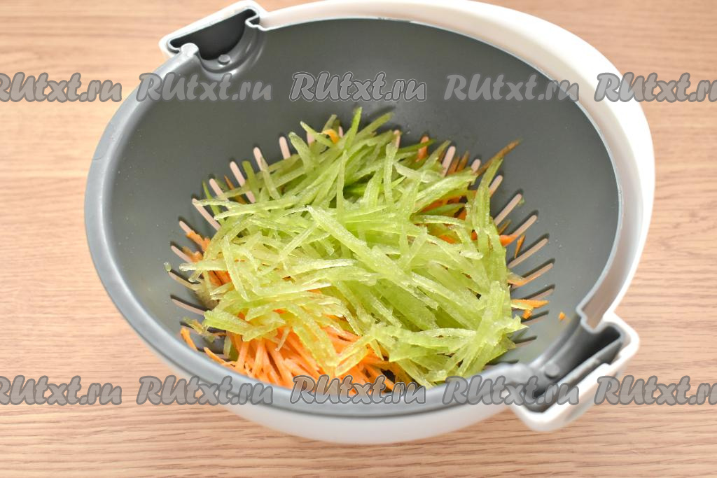 Очищаем морковь и зелёную редьку. Натираем морковку на тёрке для корейской моркови (если такой тёрки нет, можно нарезать морковь длинной, тонкой соломкой).