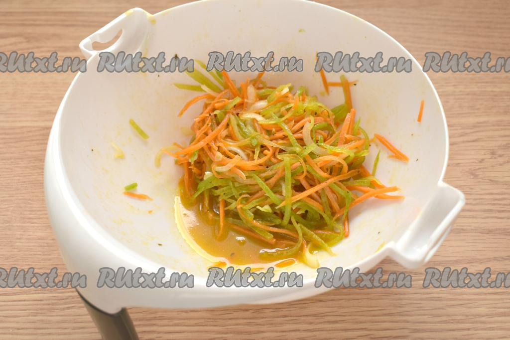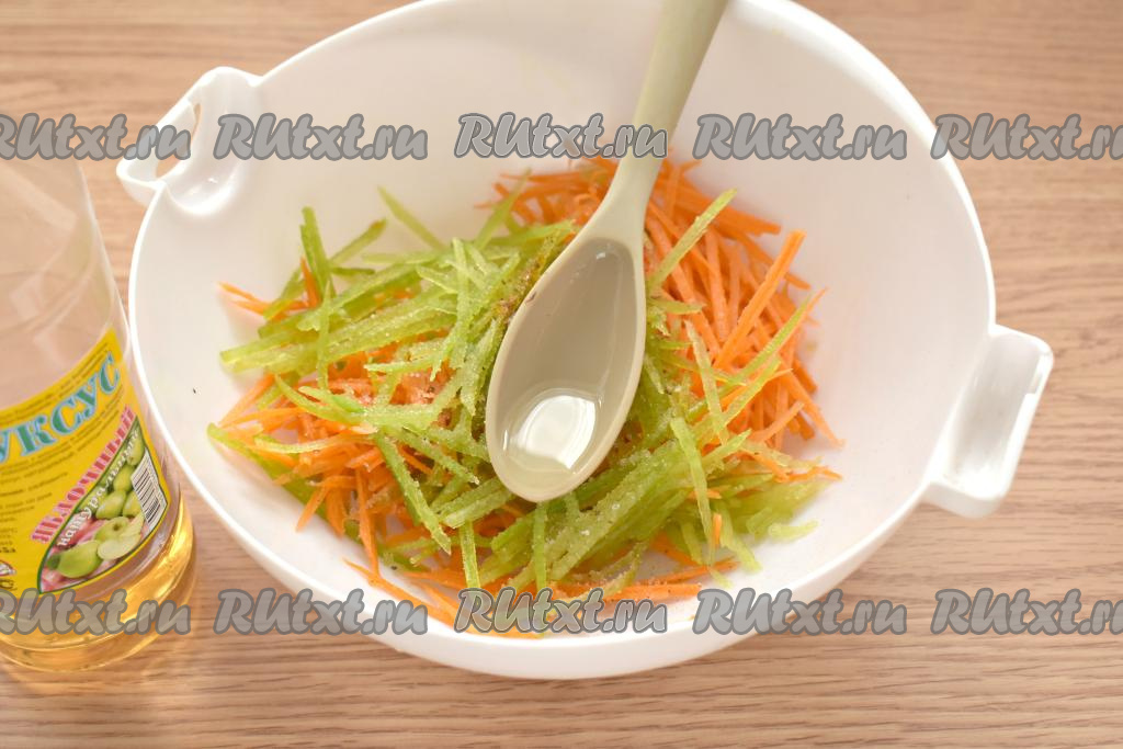 Если в готовом корейском салате из моркови и зелёной редьки будет много маринада, тогда его лучше отжать и слить.