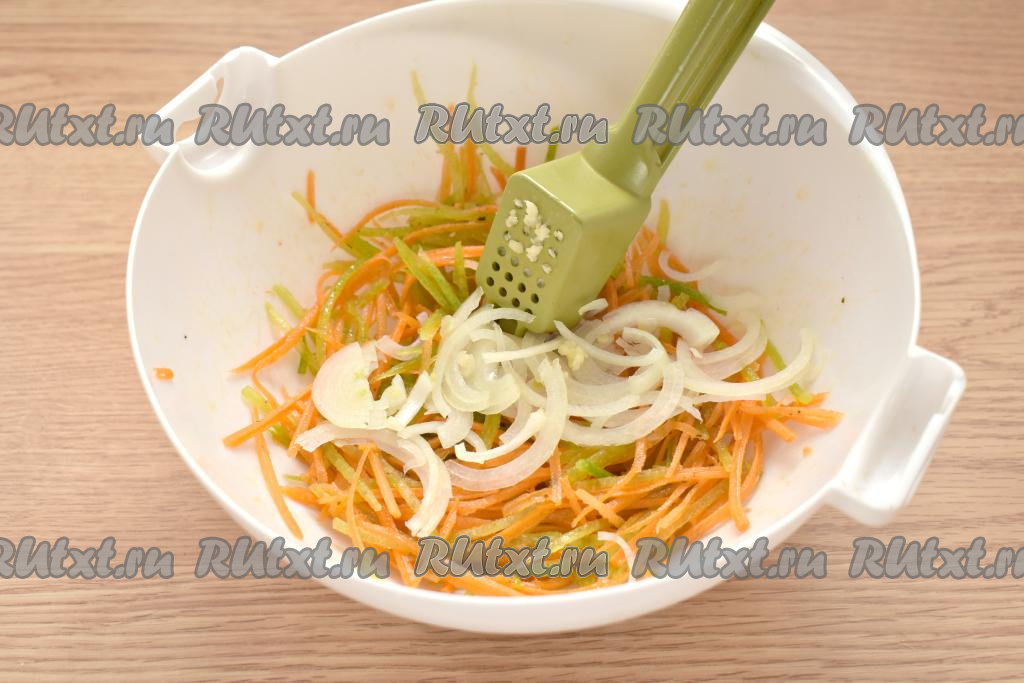 Очищаем половину луковицы, нарезаем на тонкие полукольца (или четверть кольца). Очищенные зубчики чеснока пропускаем через пресс. Лук с чесноком добавляем в салат из моркови и зелёной редьки.