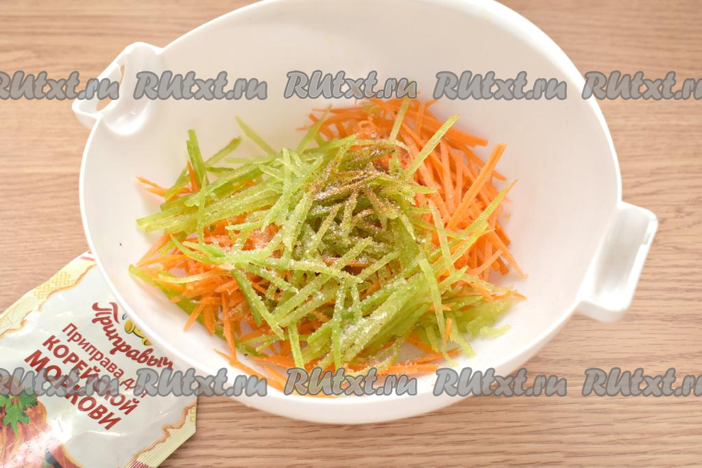 Затем морковку с зелёной редькой перекладываем в достаточно объёмную миску, посыпаем солью, сахаром, готовой приправой для корейской моркови (кстати, такую приправу можно собрать самостоятельно, включив в её состав молотый кориандр, красный жгучий и чёрный молотые перцы, паприку).
