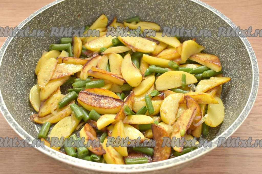 Сковороду накрываем крышкой и томим картошку со стручковой фасолью 5-7 минут. Картофель должен стать мягким.