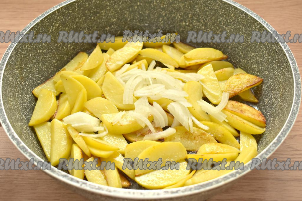 Через 10 минут добавляем к картошке лук, нарезанный на четверть кольца (или полукольца), перемешиваем, обжариваем 5-7 минут, периодически помешивая.