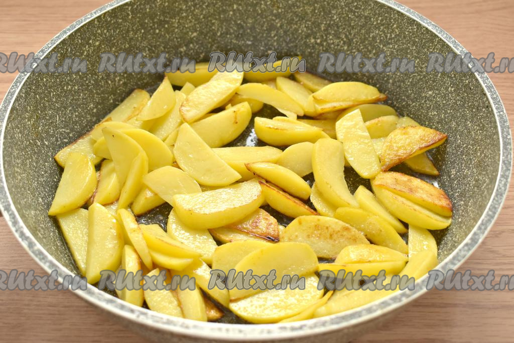 Вливаем на сковороду растительное масло, хорошо его прогреваем. Выкладываем на сковороду дольки картофеля. На среднем огне жарим картошку без крышки 10 минут, иногда перемешивая.