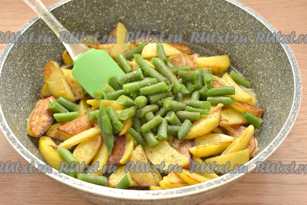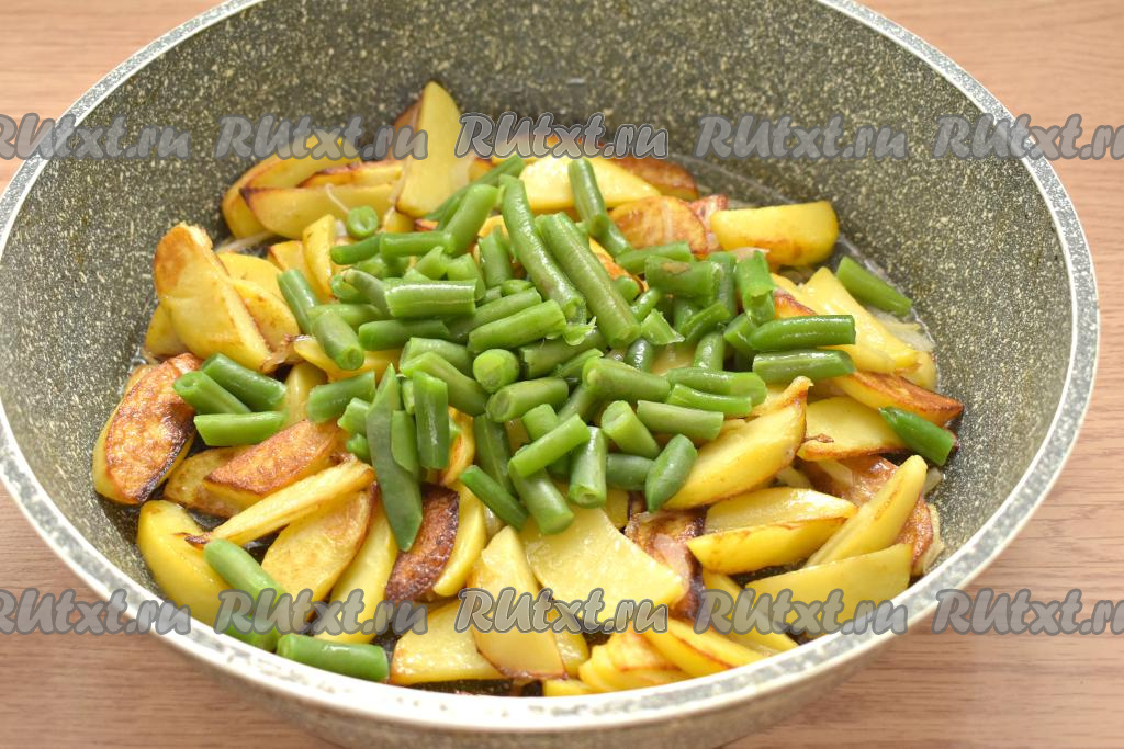 После того как картошка с луком обжарятся в течение 5-7 минут, добавляем к ним стручковую фасоль.