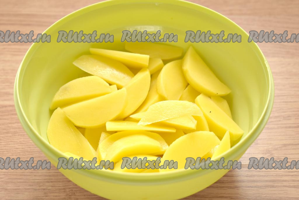 Очищаем картошку и лук, ополаскиваем овощи холодной водой. Нарезаем картофель на небольшие ломтики.