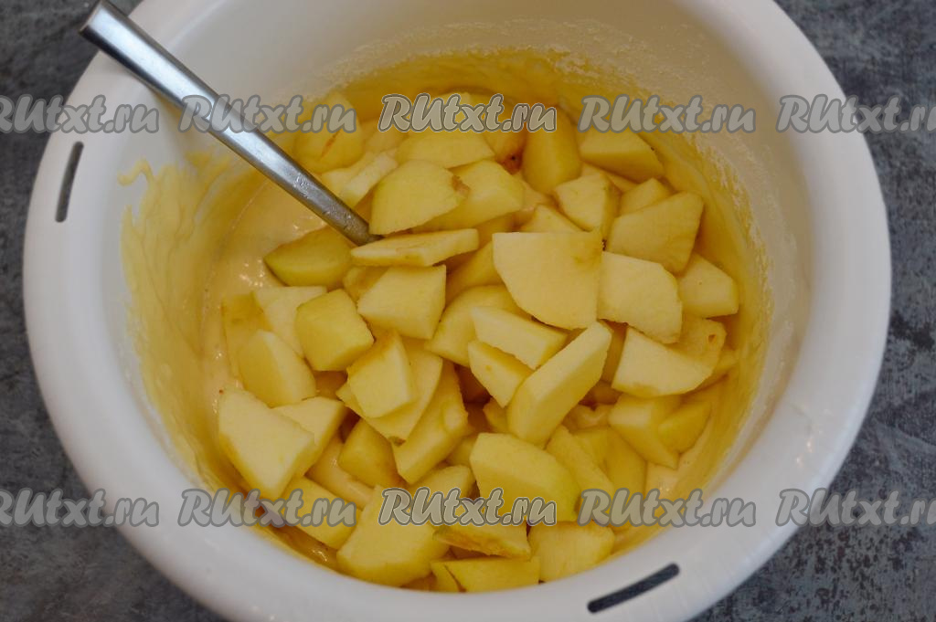Яблоки, очищенные от кожуры и семечек, нарезать на небольшие кусочки (очень крупно или очень мелко нарезать не нужно), добавить в тесто, вмешать с помощью столовой ложки (или лопатки).