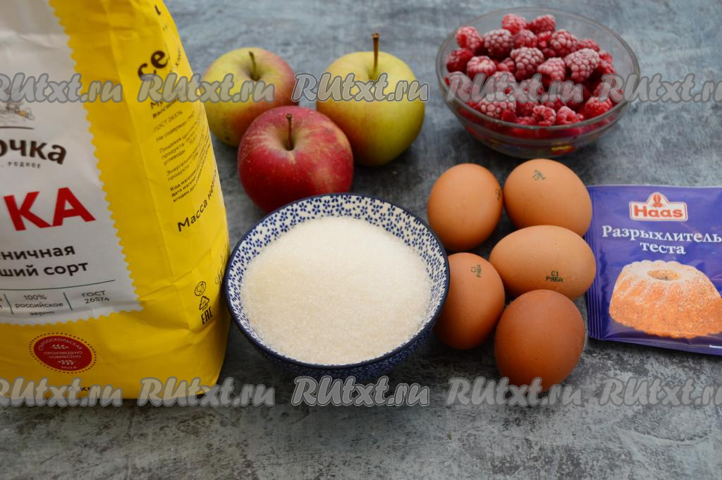 Подготовить продукты. Отмерить сахар и малину. У меня малина была замороженная, я её не размораживала (если у вас на ягодах много льда, тогда дайте малине немного разморозиться, лишнюю воду слейте). Если будете готовить шарлотку со свежей малиной, тогда её можно промыть, а затем обсушить.