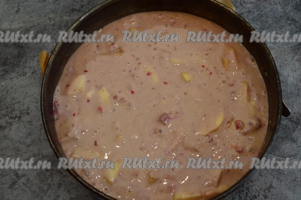 Перемешать тесто до однородности. Дно разъёмной формы (я взяла форму диаметром 23 сантиметра) застелить пергаментом, затем вылить тесто, разровнять и отправить в заранее прогретую духовку. Выпекать шарлотку с яблоками и малиной минут 45-50 при температуре 180 градусов.