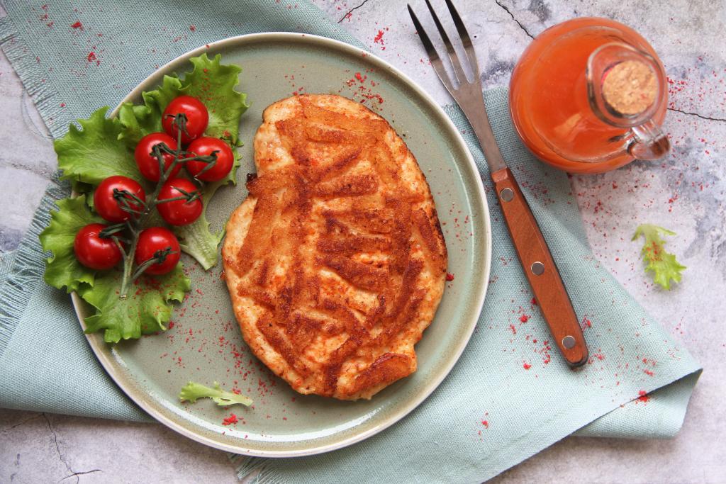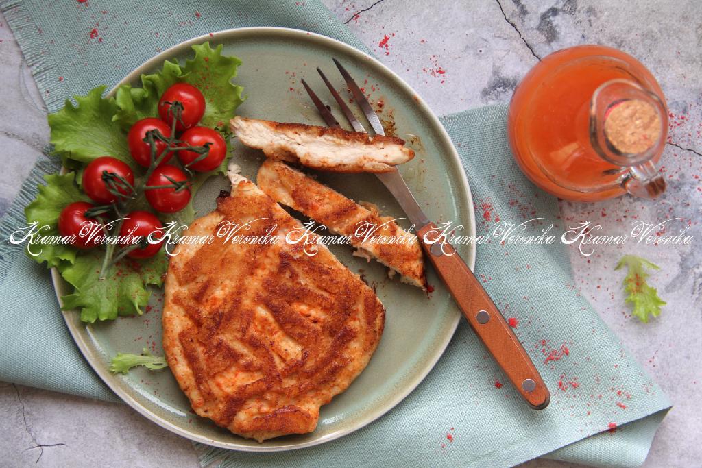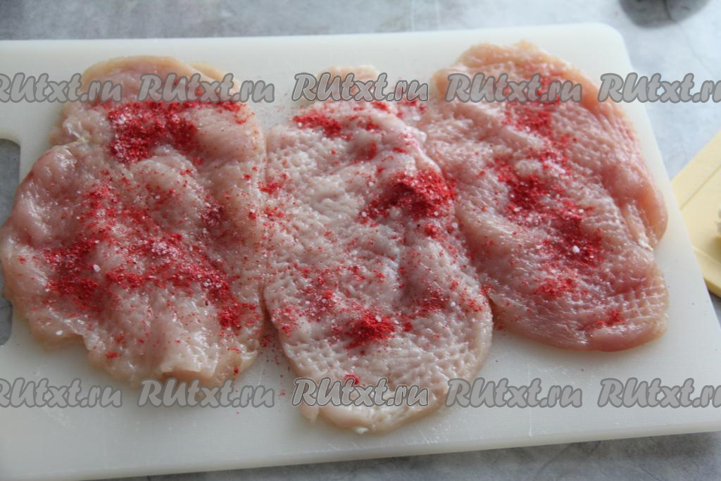 Посолить отбитые кусочки куриного мяса по вкусу, посыпать специями (я посыпала паприкой).