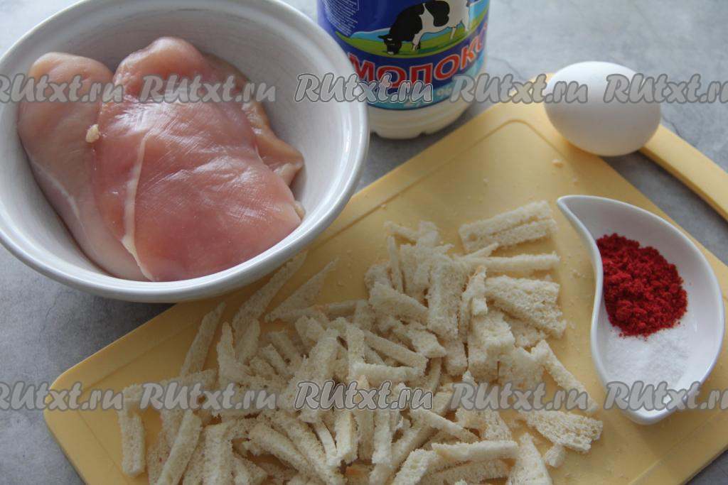Чёрствый мякиш белого хлеба нарезать на тонкие брусочки.