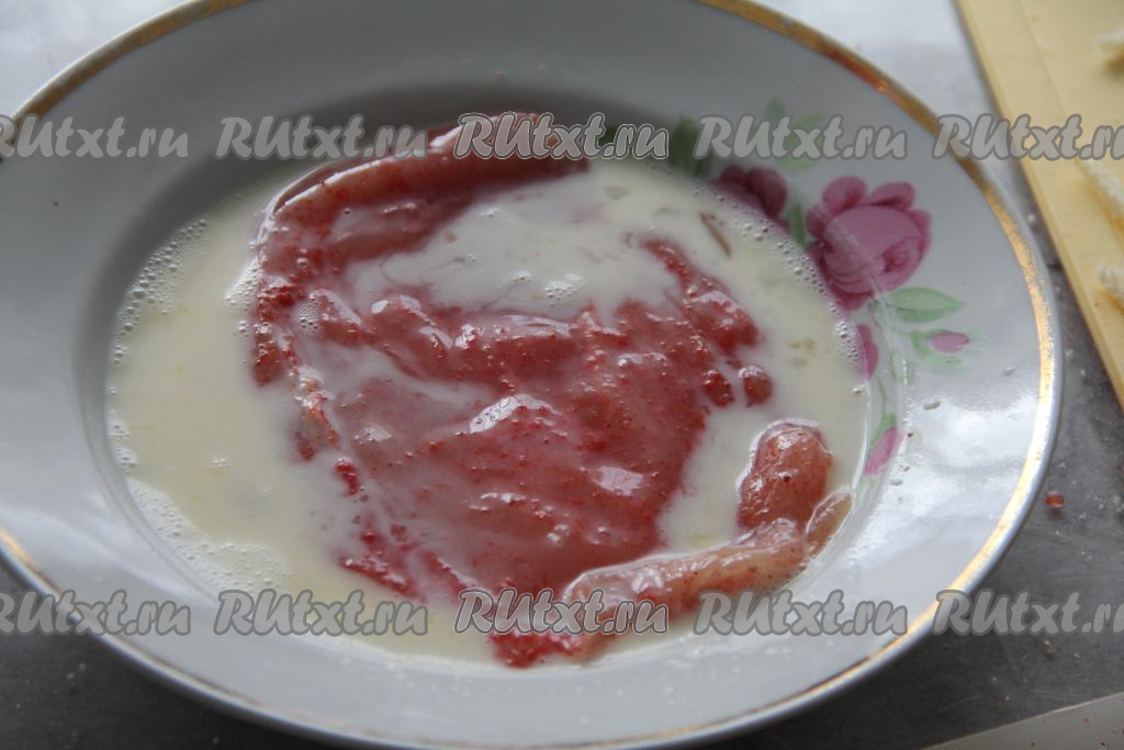 В миске соединить сырое яйцо и молоко, взбить вилкой до однородности. Обмакнуть каждое куриное филе в яично-молочный кляр со всех сторон.