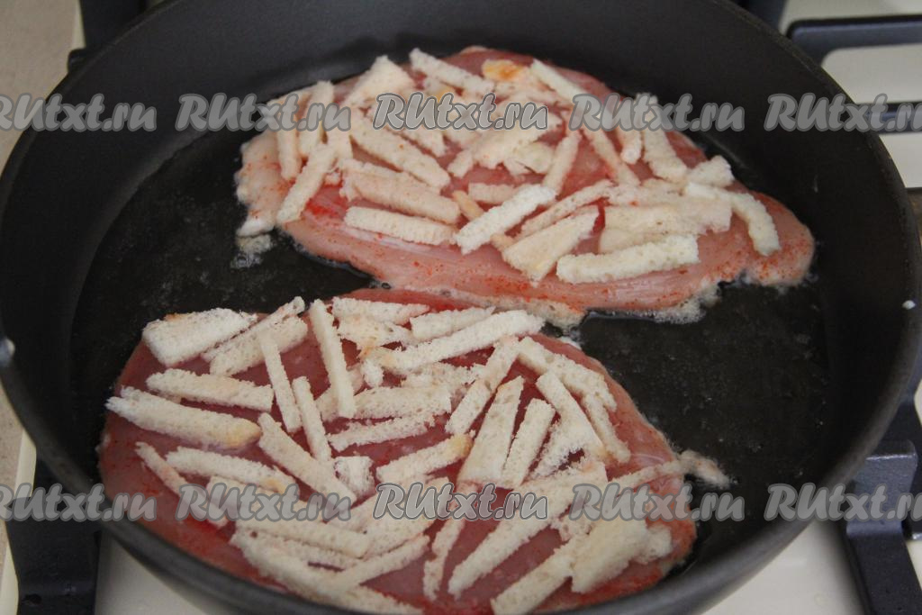 Затем куриный шницель, покрытый кляром, обвалять в брусочках белого хлеба с двух сторон. Нужно как бы обклеить шницель хлебом.