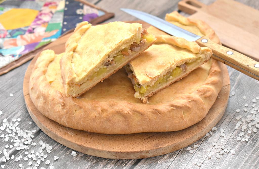 Готовый курник со свининой и картошкой достаём из духовки, даём немного остыть, накрыв полотенцем. Тёплый или полностью остывший пирог нарезаем на порции и угощаемся. Домашний курник получается очень вкусным и сытным, попробуйте!
