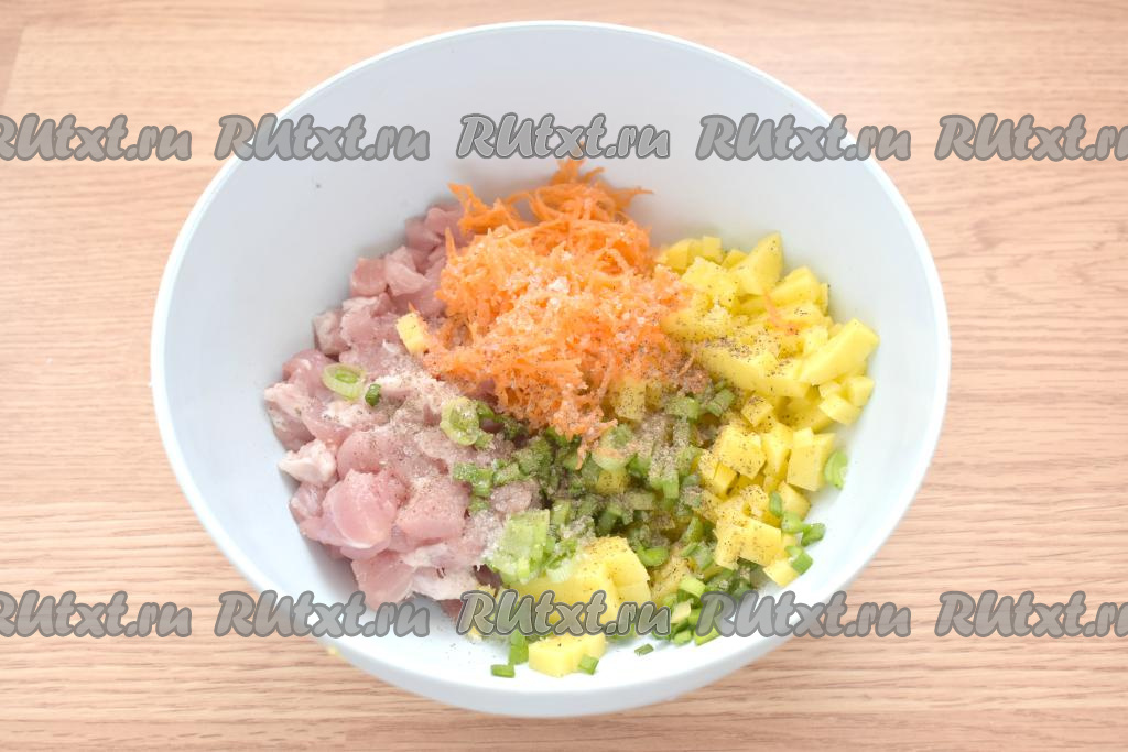 Для приготовления начинки очищаем картошку и морковку. Промываем перья зелёного лука. Мякоть свинины и картошку нарезаем на маленькие кубики, выкладываем в миску, добавляем морковь, натёртую на средней тёрке, и мелко нарезанный зелёный лук, по вкусу солим, сдабриваем специями (я использовала чёрный молотый перец и паприку), перемешиваем и начинка для курника готова.