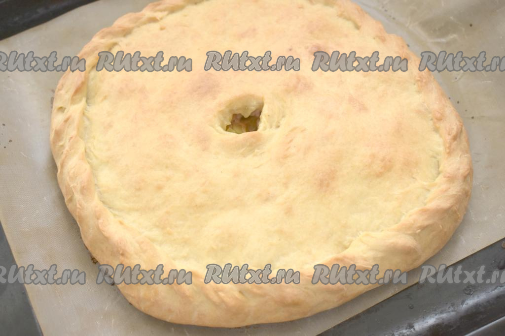 Раскатываем вторую часть теста. Накрываем им начинку. Скрепляем края, а в центре делаем отверстие для выхода пара. Поверхность пирога смазываем молоком.