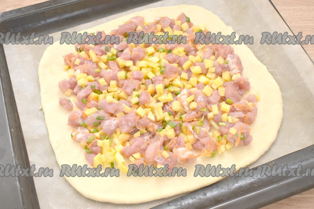 Охлаждённое тесто делим на две части. Одна часть должна быть чуть больше - это будет основание курника. Раскатываем большую часть теста в круглую или овальную заготовку (примерный диаметр 28 сантиметров), выкладываем на противень, застеленный специальным листом для выпечки (или пергаментом). Распределяем по тесту начинку, отступая от краёв теста по 2 сантиметра.