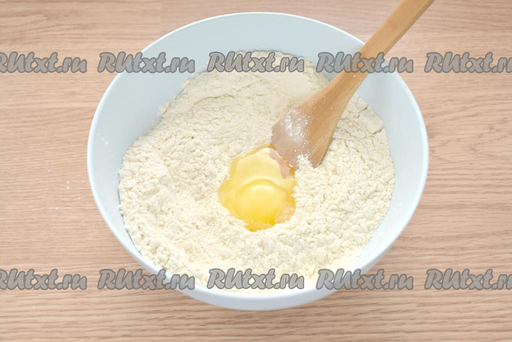 В центр мучной смеси разбиваем яйцо. Перемешиваем его с мукой ложкой.