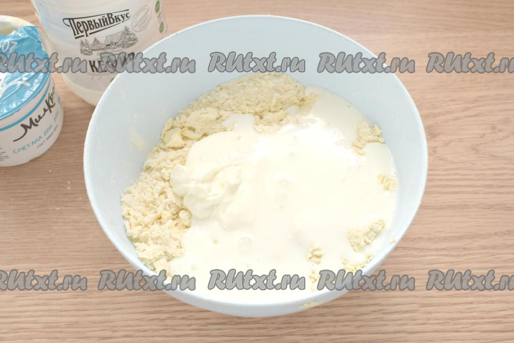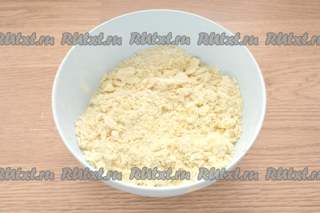 Перетираем в миске руками масло с мукой, получится мучная крошка, как на фото.