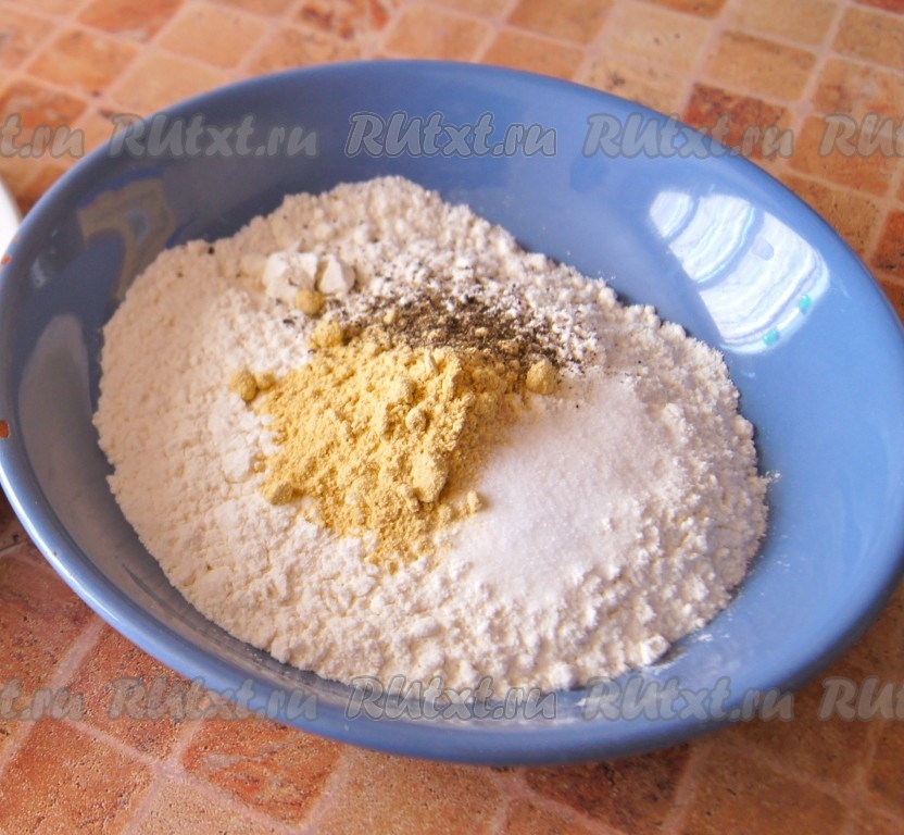 В тарелку насыпать муку, горчицу, соль, молотый чёрный перец, перемешать мучную смесь.