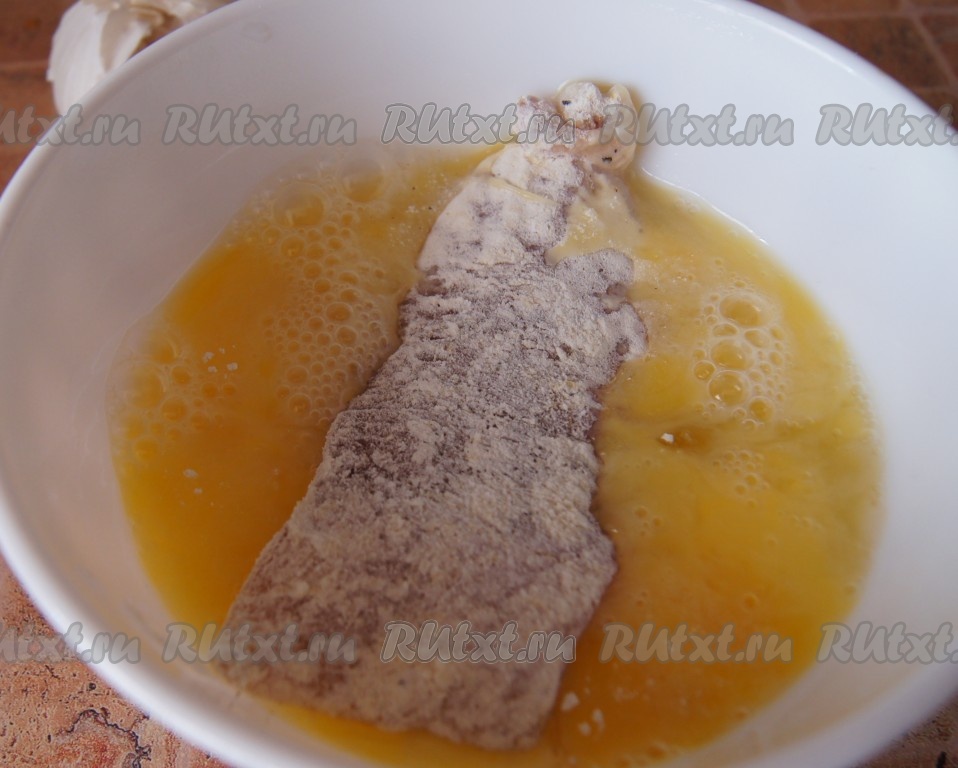 В отдельной тарелке взбить вилкой яйца. Во взбитые яйца обмакнуть с двух сторон филе толстолобика, покрытое мучной смесью.