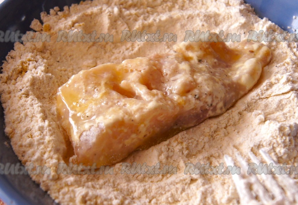 Филе толстолобика покрыть со всех сторон получившейся мучной смесью, как на фото.