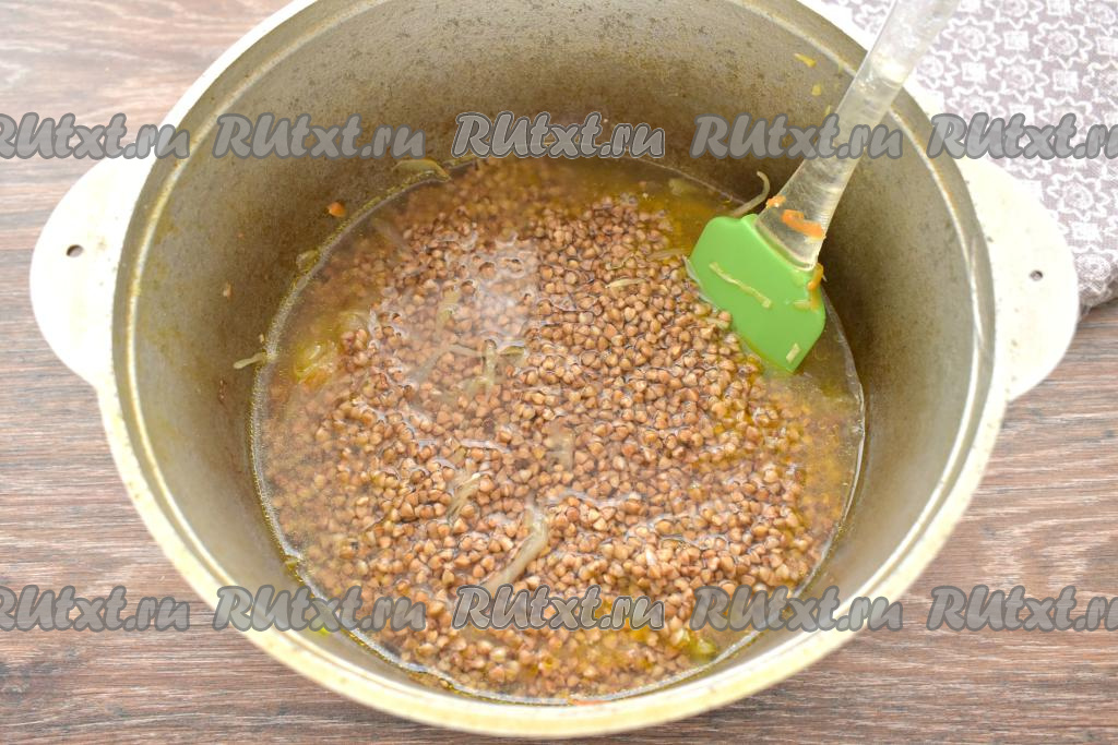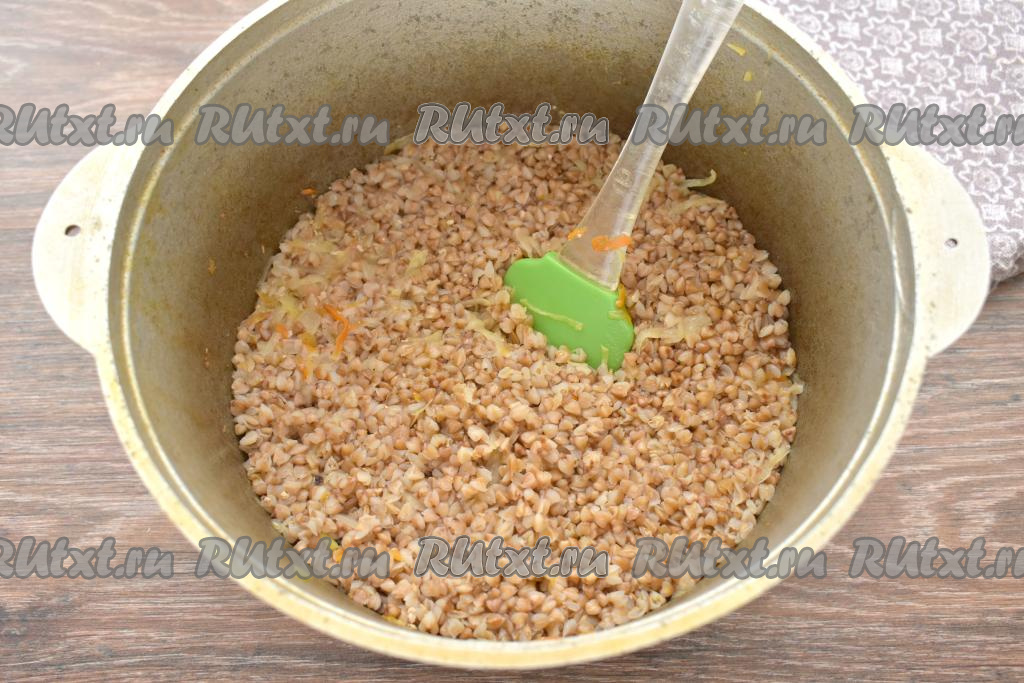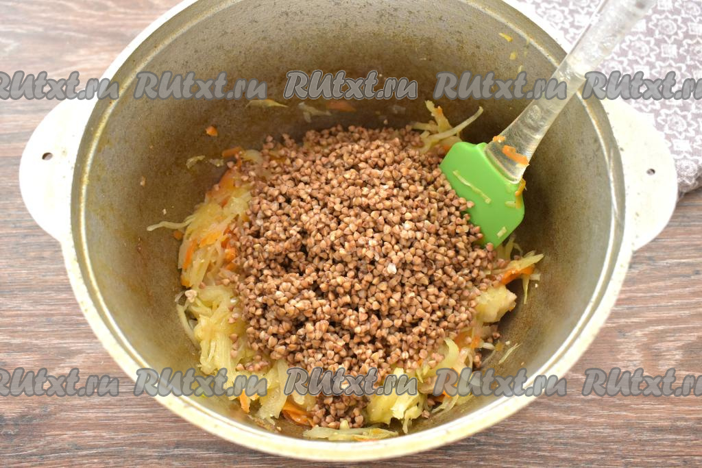 Гречку, если нужно, перебираем, удаляя испорченные зёрна, затем промываем крупу под проточной водой, перекладываем в сито, чтобы с гречки стекла лишняя вода. После того как капуста протушится с мясом 10 минут, добавляем промытую гречку.