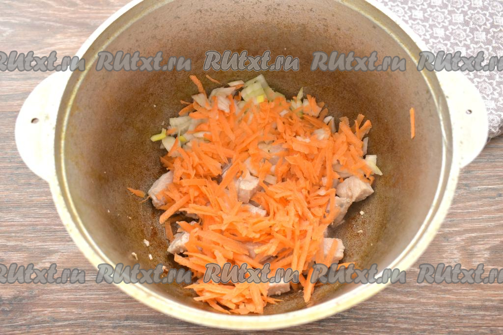 Лук и морковь очищаем. К обжаренному мясу выкладываем лук, нарезанный кубиками, и морковку, натёртую на крупной тёрке. Периодически перемешивая, обжариваем мясо с овощами минут 5, иногда помешивая.