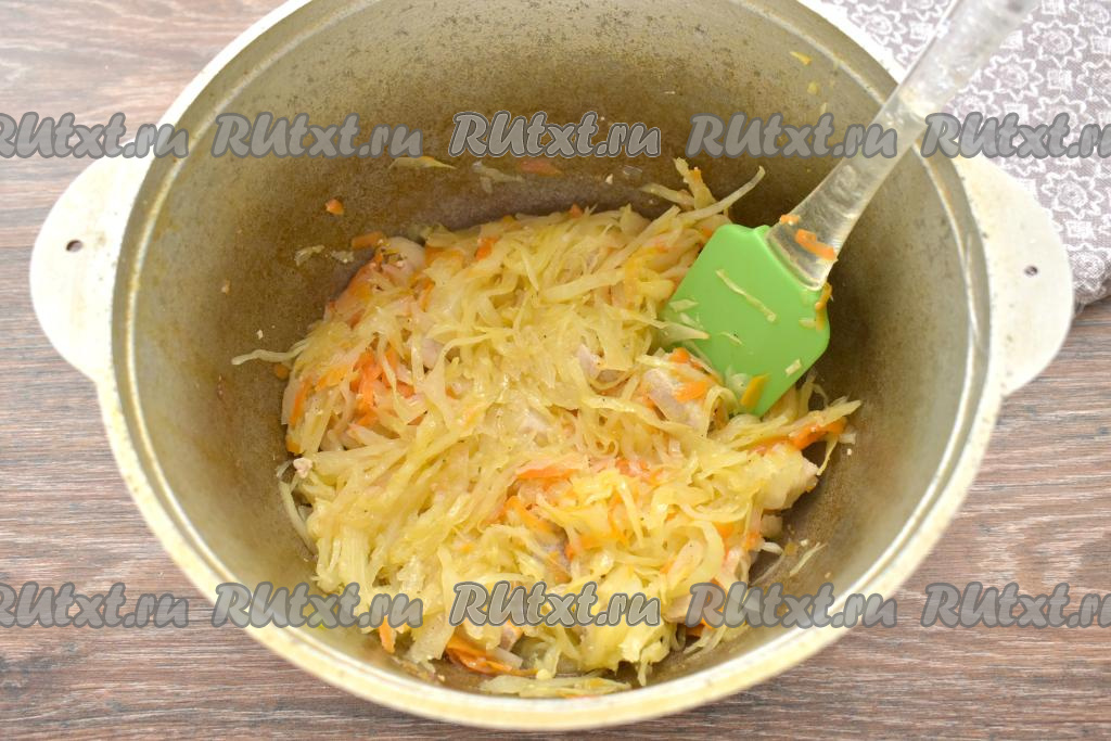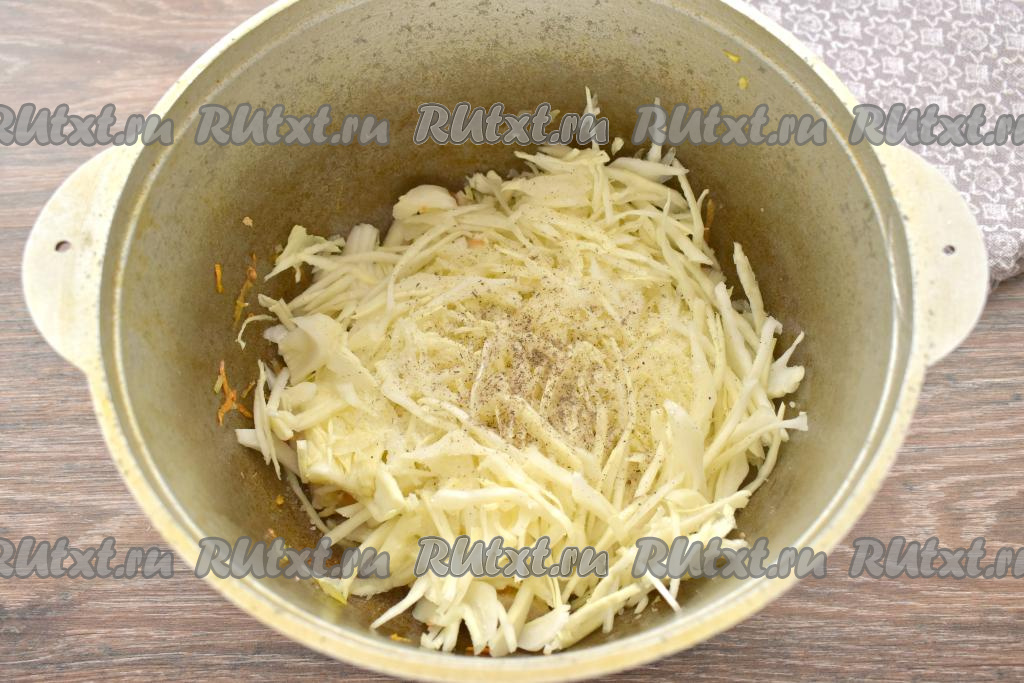 Затем добавляем тонко нарезанную капусту, вливаем 100 миллилитров кипячёной воды, солим и перчим по вкусу, перемешиваем.