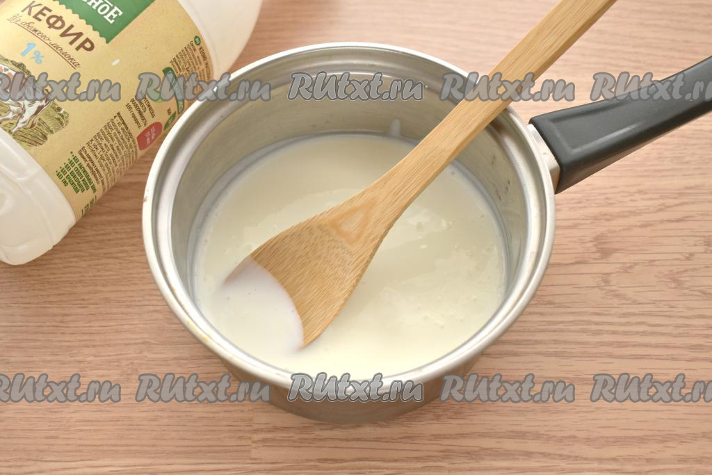 В первую очередь подготовим кефир. Для замешивания теста он должен быть комнатной температуры (слегка тёплым). Кефир переливаем в небольшой ковшик и при постоянном помешивании доводим его до нужной температуры. Следите, чтобы кефир не свернулся.