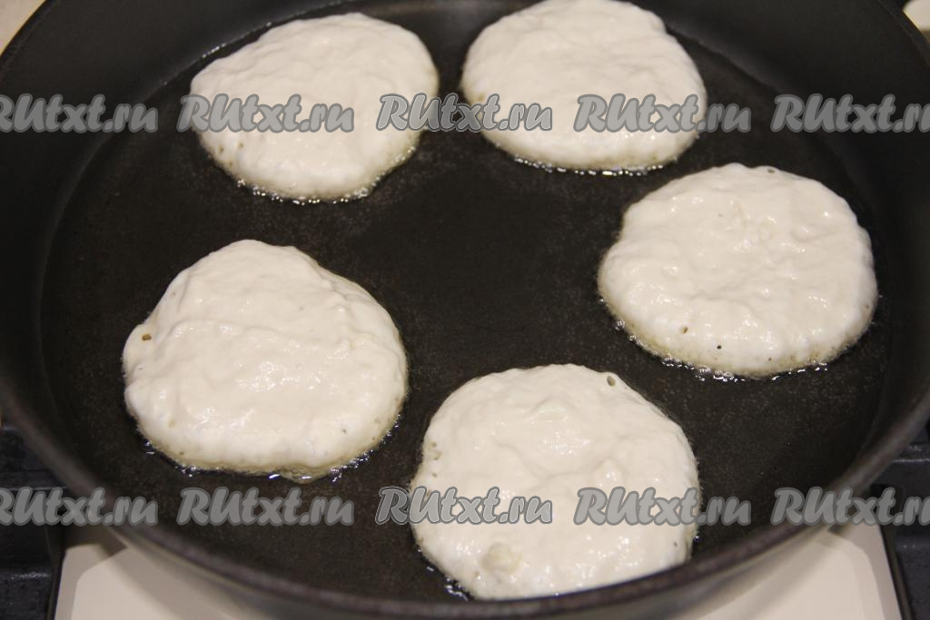 В сковороду влить растительное масло. Должно быть столько масла, чтобы оно закрывало дно сковороды. Очень хорошо разогреть масло. Выкладывать по 1 столовой ложке теста, формируя оладьи.