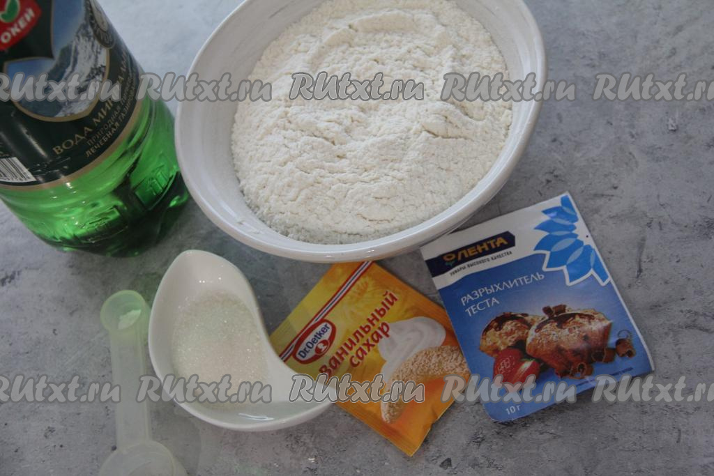 В достаточно глубокую миску всыпать просеянную муку, добавить сахар, разрыхлитель, ванильный сахар и соль, перемешать сухие ингредиенты.