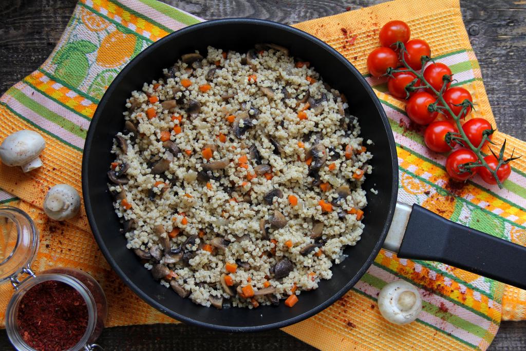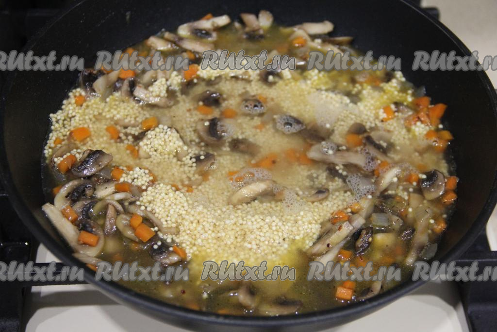 Влить в сковороду 250 миллилитров воды комнатной температуры, довести до кипения, убавить огонь до минимума. Сковороду накрыть крышкой и готовить минут 25 (до полного испарения воды и мягкости пшена).