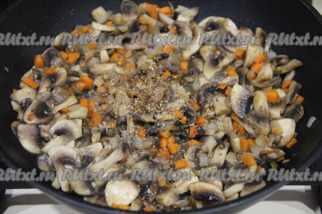Обжарить грибы с овощами в течение 7 минут, не забывая время от времени помешивать. Добавить соль и специи, перемешать.