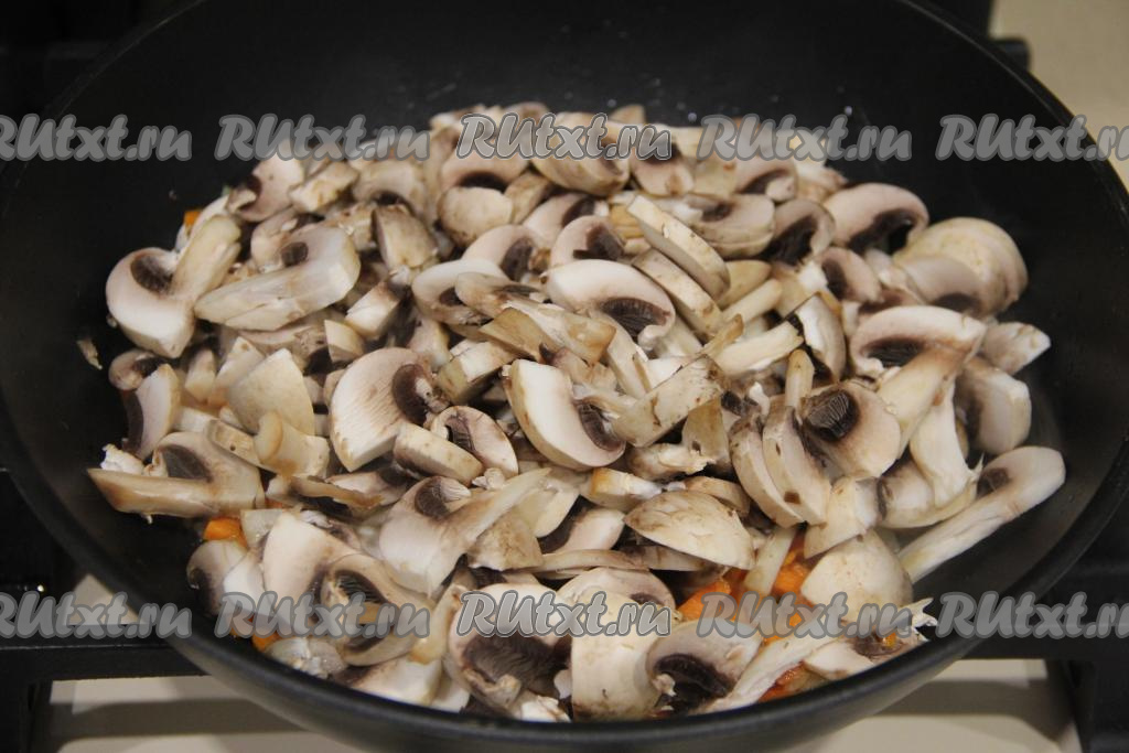 Шампиньоны нарезать на пластинки (если вы готовите с отваренными лесными грибами, тогда крупные грибочки нужно будет нарезать на части), добавить в сковороду к обжаренным овощам, перемешать.