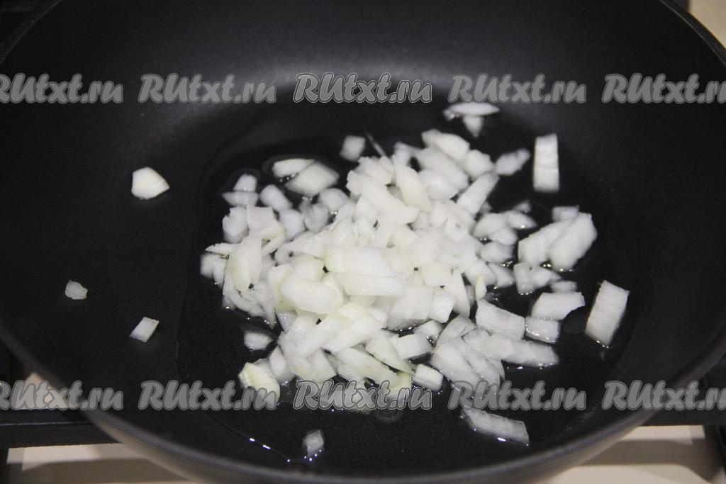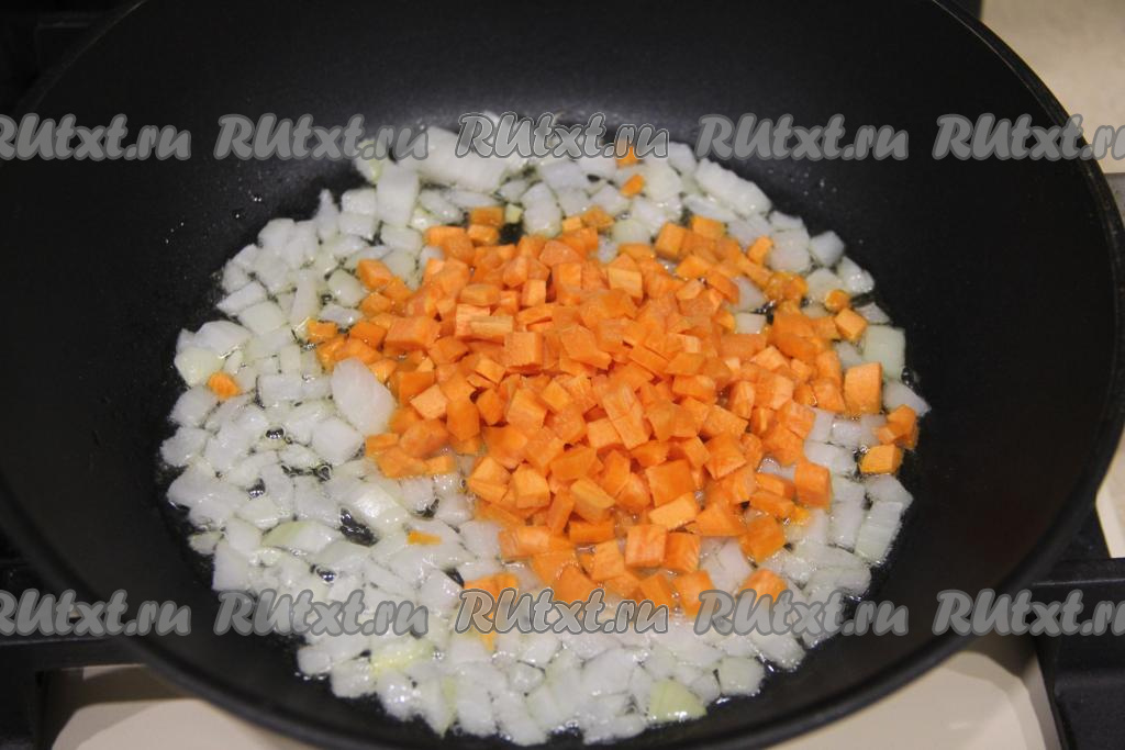 Морковь нарезать на мелкие кубики (или натереть на крупной тёрке), добавить к луку, обжаренному до прозрачности, перемешать. Обжаривать овощи минут 5-6, не забывая их периодически перемешивать.