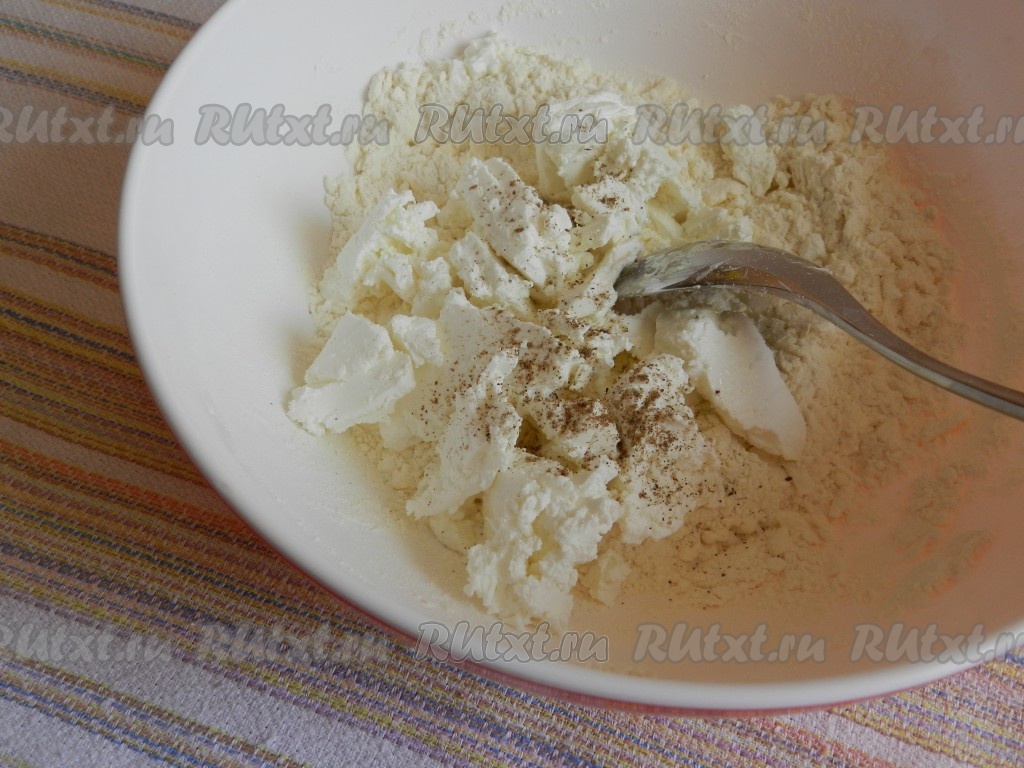 Холодное масло растереть в крошку с мукой и разрыхлителем.