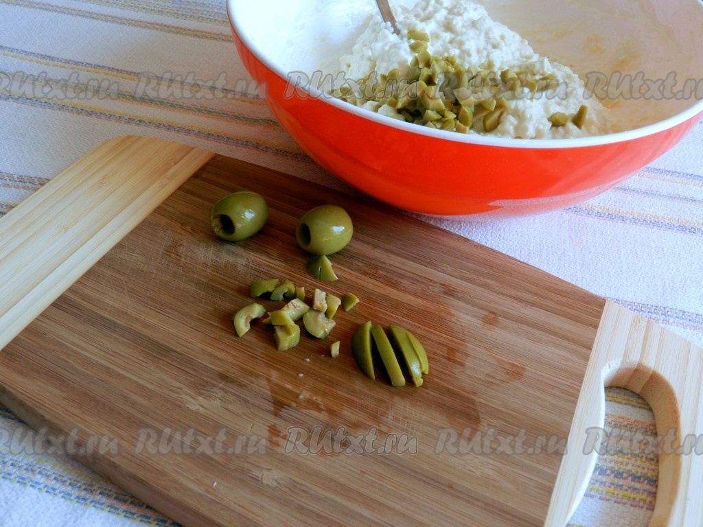 Оливки нарезать и добавить в тесто.