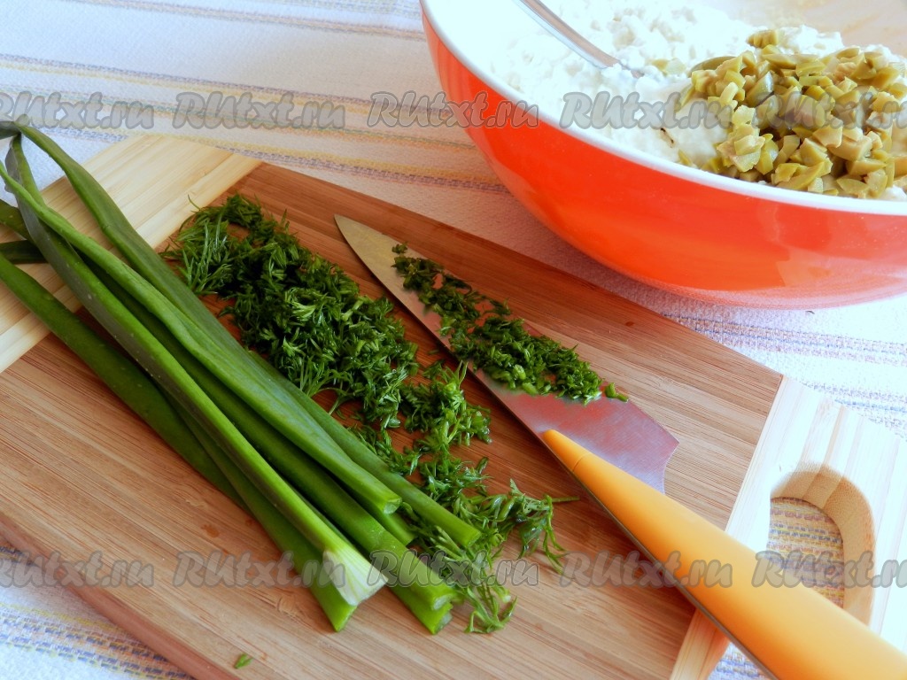 Мелко нарезать зеленый лук и укроп и также добавить в тесто для маффинов.